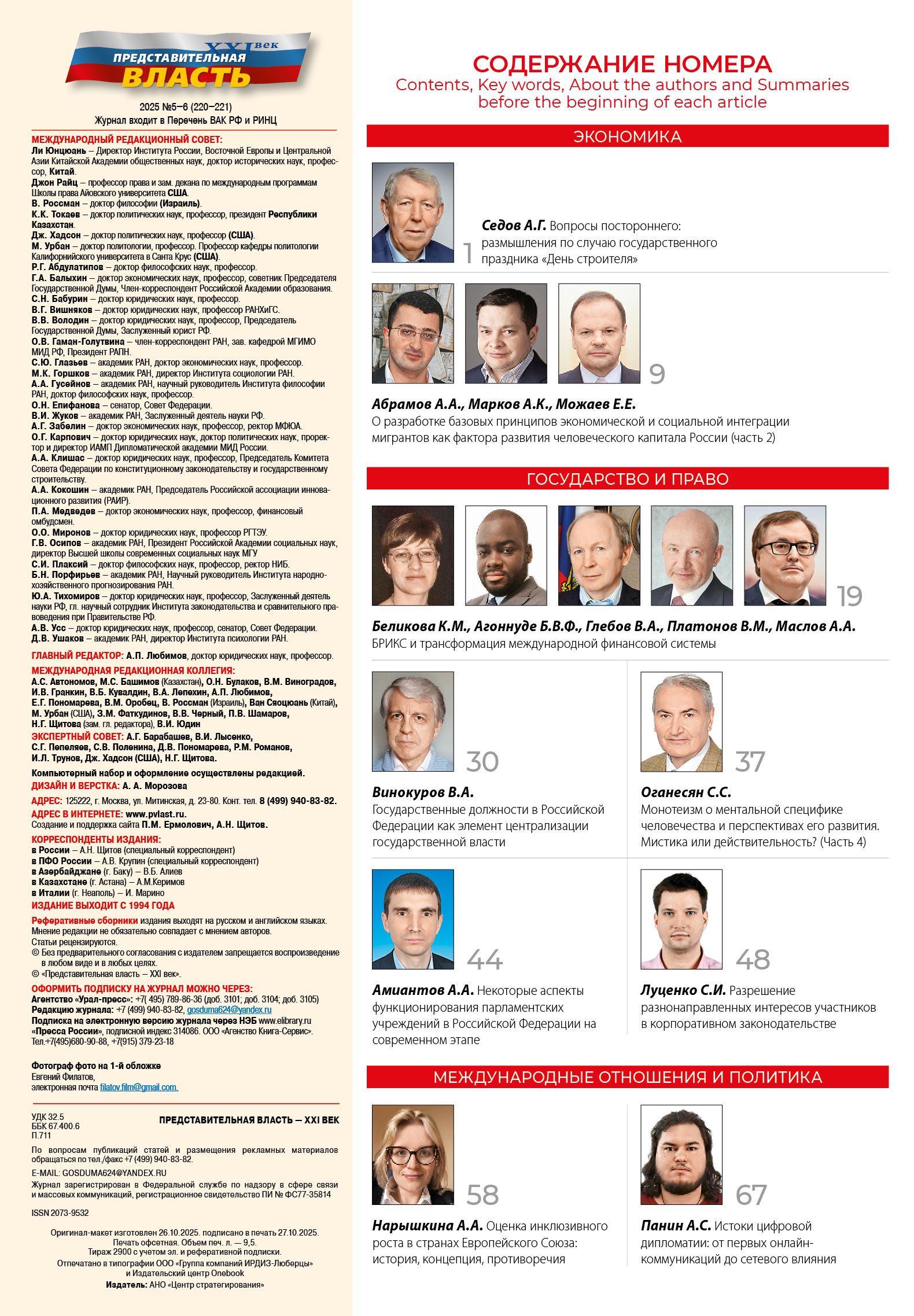 Журнал Представительная власть - XXI век – рецензируемый журнал, публикующий оригинальные научные статьи c результатами передовых теоретических и прикладных исследований в ключевых областях экономики, права, политики, социологии - социально-гуманитарным наукам и специальностям, информирующий читателей о возможных альтернативных сценариях будущего для своевременного принятия правильных решений.